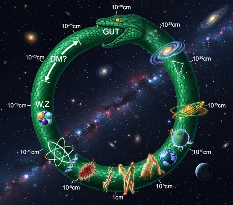 The Cosmic Uroboros is a graphic representation of the hierarchy of size. The image of a snake eating its own tail is a symbol appearing in ancient Egyptian, Greek, Norse, and Indian art. The symbol is thought to represent self-reflectivity and self-regeneration. In a rendering of the uroboros by cosmologist Joel Primack and co-author Nancy Abrams, the hierarchy of size is plotted in powers of ten along the circle. [2] The universe is swallowing its own tail, because the very large scale of the universe loops back on the very small scale of subatomic particles.